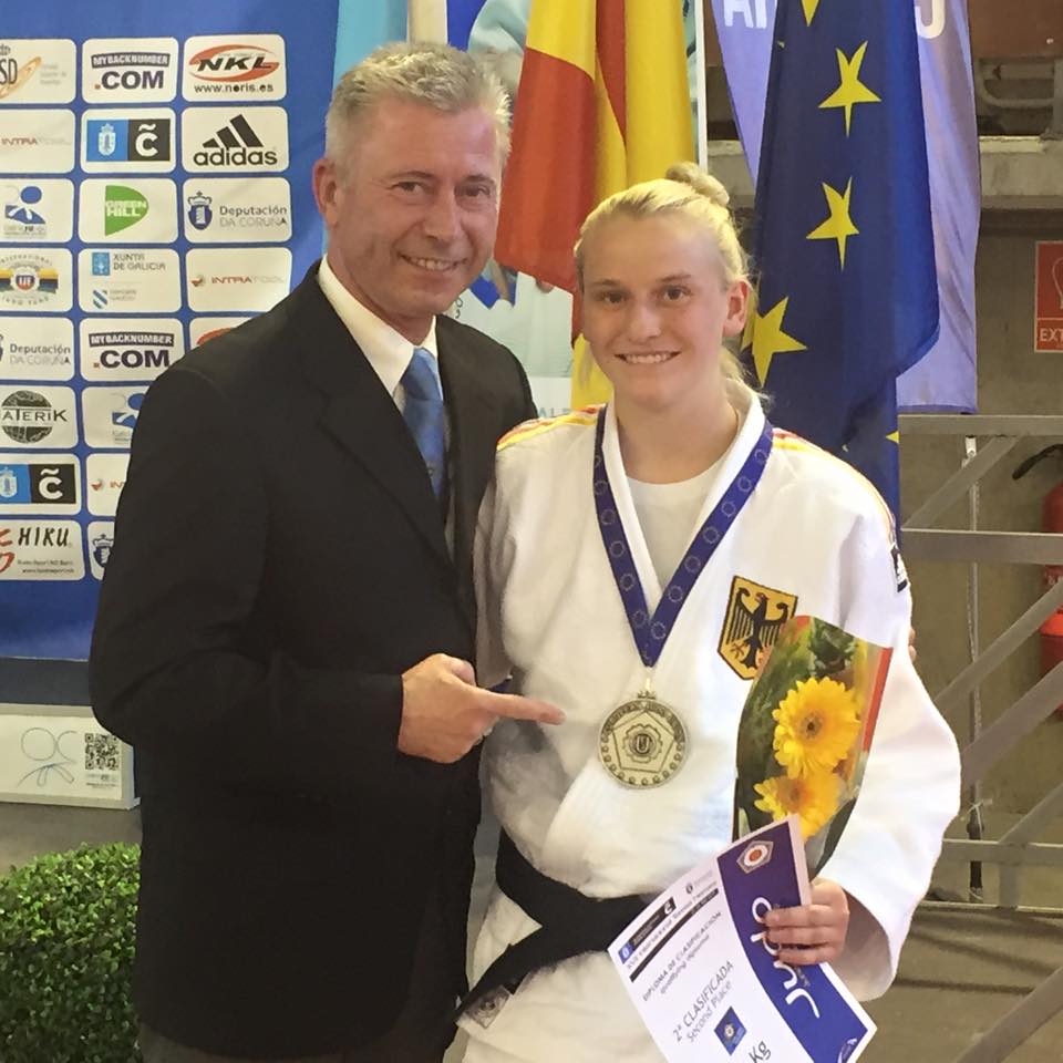 Nach Bronze in Kaunas (LTU) holt Pauline Starke Silber in La Coruna. Und das mit einer bärenstarken Leistung: Sie schlägt zunächst Caggiano (ITA) mit hoher Wertung und Bezalel (ISR) vor Ablauf der regulären Kampfzeit. Im Viertelfinale gegen die Weltranglisten-Fünfte Livesey (GBR) gelingt Pauline erneut der Sieg vor Ablauf der Kampfzeit nach 2:29 Min. mit Ura Nage (Rückwurf). Diese Wertung wiederholt sie schließlich auch im Halbfinale gegen die deutsche Teamkollegin, Amelie Stoll, Nr. 13 der Weltrangliste, die bereits mit einer hohen und einer mittleren Wertung in Führung lag. Gegen deren Schwester Theresa ist im Endkampf bei Pauline die Luft raus. Sie verliert im Haltegriffe, erhält als jüngste Deutsche dennoch ein riesen Lob von Bundestrainer Pusa.